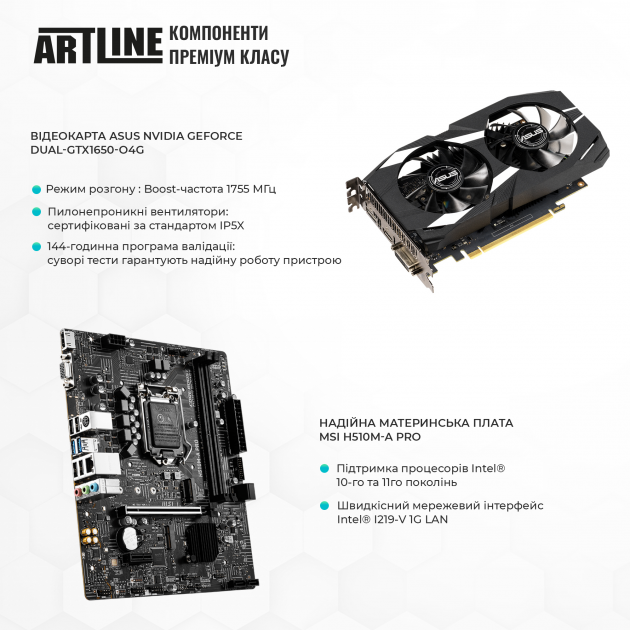 ARTLINE Gaming is a gaming personal computer, whose vocation is to be an entertainment center for any user. During the creation of models, careful selection, assessment of capabilities and compatibility with each component is carried out. The ARTLINE Gaming X33v14 gaming PC is built on the platform of the ASUS PRIME H510M-K motherboard. It is optimized for Intel 10th generation processors. It has ASUS OptiMem technology, which increases the overclocking potential and provides high stability in RAM. As well as a set of all modern interfaces and ports (USB 3.2 Gen1, Gigabit Ethernet, slots of high-speed solid state drives M.2) and much more.